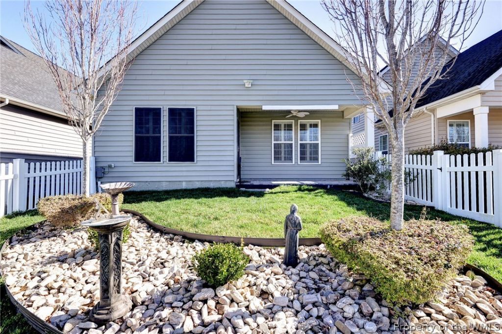 Welcome Home to 4381 Harrington Commons! Easy to see why the Belle Grove Cottage home is one of the favorite designs built in Colonial Heritage. Enjoy the comfort of low maintenance living in this charming home. It starts with elegant curb appeal- brick front exterior upgrade and a custom paved sidewalk leading you to an exquisite front porch setting. Inside you'll discover a wonderful layout that makes sense! Two bedrooms, 2 baths, Flex Room and a casually elegant family room & dining area! The upgraded designer kitchen, with counter island seating for two, overlooks a gorgeous fenced backyard and wooded setting. Enjoy spending time on the back porch amongst a professionally designed landscaped yard with ambient evening lighting. The two car garage offers plenty of storage options. Time to enjoy the good life in Williamsburg's premiere 55+ resort style community...it's that good!